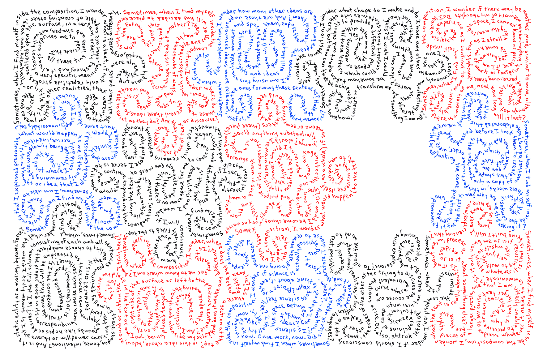 Handwritten reflections, from the point of view of the text itself, expressing what it feels to be words and ideas flowing incessantly upon space and time